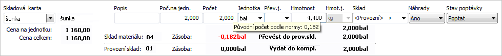 - Náhrada suroviny: Pri náhrade surovín sa počty prepočítajú podľa pomeru hmotností zadaných jednotiek, viď funkcia Nahradiť suroviny.