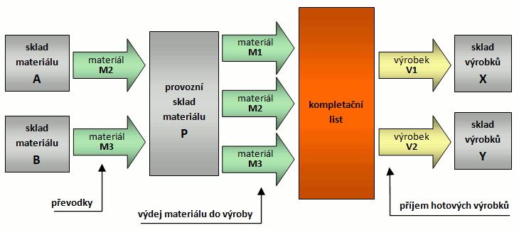 X sa vyrobí na sklad A, odtiaľ sa prevedie (prevodkou) na sklad B a v sklade B sa vloží ako nevyrábaný polotovar do finálneho výrobku Y