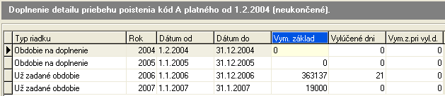 Hodnoty Vymeriavacieho základu, Vylúčenej doby a Vymeriavacieho základu pri vylúčenej dobe, ktoré doplníme do riadka roku 2004, sa uložia v subzáložke Detail priebehu do záznamu s mzdovým obdobím 2004/12.