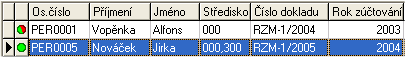 Príklad zobrazenia v stĺpci Strediska, keď zamestnanec Jozef Nováčik má prac. pomery na 2 strediskách 000 a 300. Preto ani nie je možné podľa strediska v záložke Obmedzenie v tejto agende obmedzovať. Ide len o informatívnu položku. Z toho istého dôvodu sa na zobrazené stredisko ani neuplatňuje obmedzenie podľa prístupových práv používateľa na zobrazenie resp. použitie chráneného objektu strediska, ktoré sa inak na chránené objekty bežne uplatňuje viď Obmedzenie verzus Prístupové práva. |