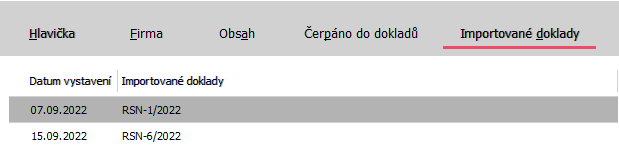 Subzáložka zobrazuje seznam dokladů dosud naimportovaných do dané objednávky vydané. Nezobrazujú sa tu všetky doklady, ktoré mohli byť použité na naimportovanie riadkov do aktuálneho dokladu, ale len vybrané doklady a to typicky tie, pri ktorých je v ich riadkoch evidované, čo z nich už bolo čerpané do aktuálneho dokladu (viď položka Čerpané v riadkoch takých dokladov). Záložka teda nie je určená na prehliadanie väzieb na prípadné iné doklady. Jej význam je predovšetkým v tom, že je tu možné taký naimportovaný doklad celý odpojiť.