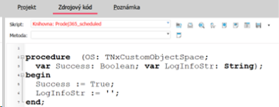 Pro správnou funkčnost je nutné mít skript zařazen pod Druh skriptu: Agenda a vybranou Třídu objektu: Faktúry vydané (IssuedInvoices). Kód automaticky získává ID aktuálně vybraného dokladu pomocí přetypování na TDynSiteForm.