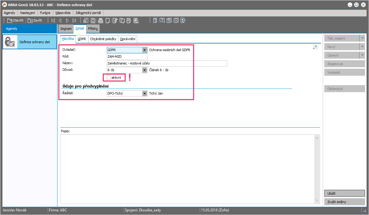 V tomto kroku nechajte položku Aktívny nezačiarknutú (!) - začiarknutie položky by znamenalo okamžité zamedzenie prístupu používateľov ku chráneným položkám, pretože v tejto chvíli ešte neexistujú povolenia ku spracovaniu dát. Definici si nastavte jako aktivní později, až po vygenerování návazných povolení ke zpracování dat.