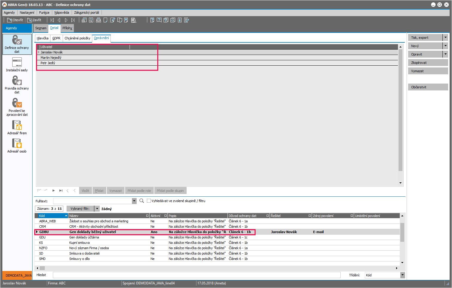 To ale samo o sobě pro ochranu dle GDPR nestačí. Tím je pouze dáno, že položka je chráněná a nikdo jiný, než vyjmenovaní uživatelé se k ní nedostanou. Zda se k ní ale dostanou vyjmenovaní oprávnění uživatelé u jednotlivých subjektů (v tomto případě firem), ještě u ochrany dle GDPR závisí na existenci povolení od daného subjektu. Tudíž musí existovat nějaké relevantní povolení ke zpracování dat od jednotlivých subjektů, které se odkazuje na tuto definici (mohlo vzniknout např. automatickým generováním z dokladů či ze smlouvy na základě pravidel, viz Vytváření povolení podle pravidel):