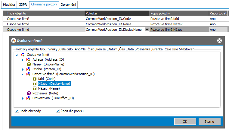 Pokud chceme chránit firemní telefon a mail, musí definice obsahovat nastavení ochrany pro objekt Osoba ve firmě nísledovně: