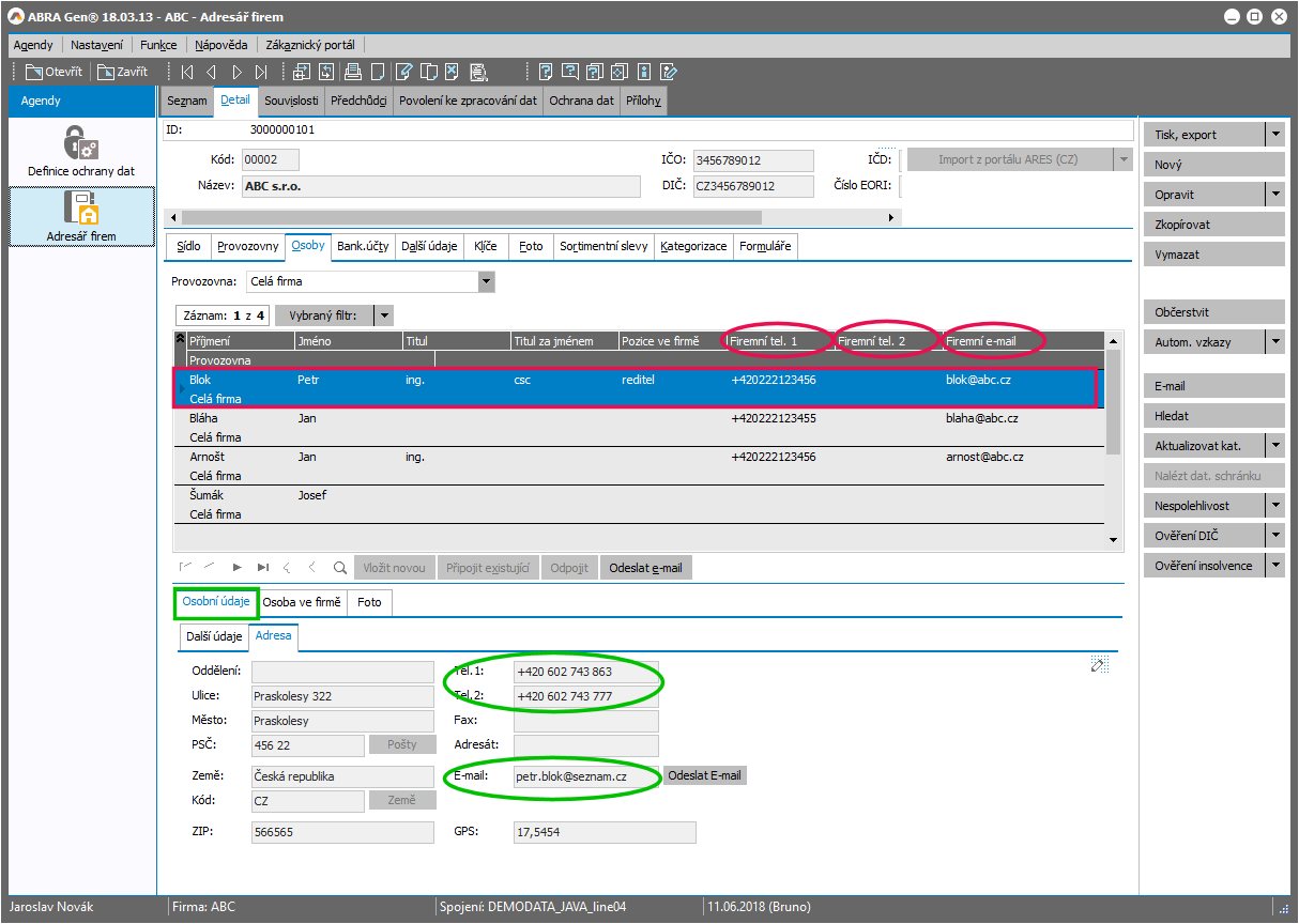 Firemní kontaktní údaje vyznačeny červeně, osobní kontaktní údaje z Adresáře osob vyznačeny zeleně