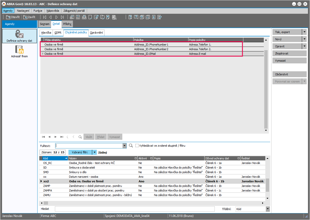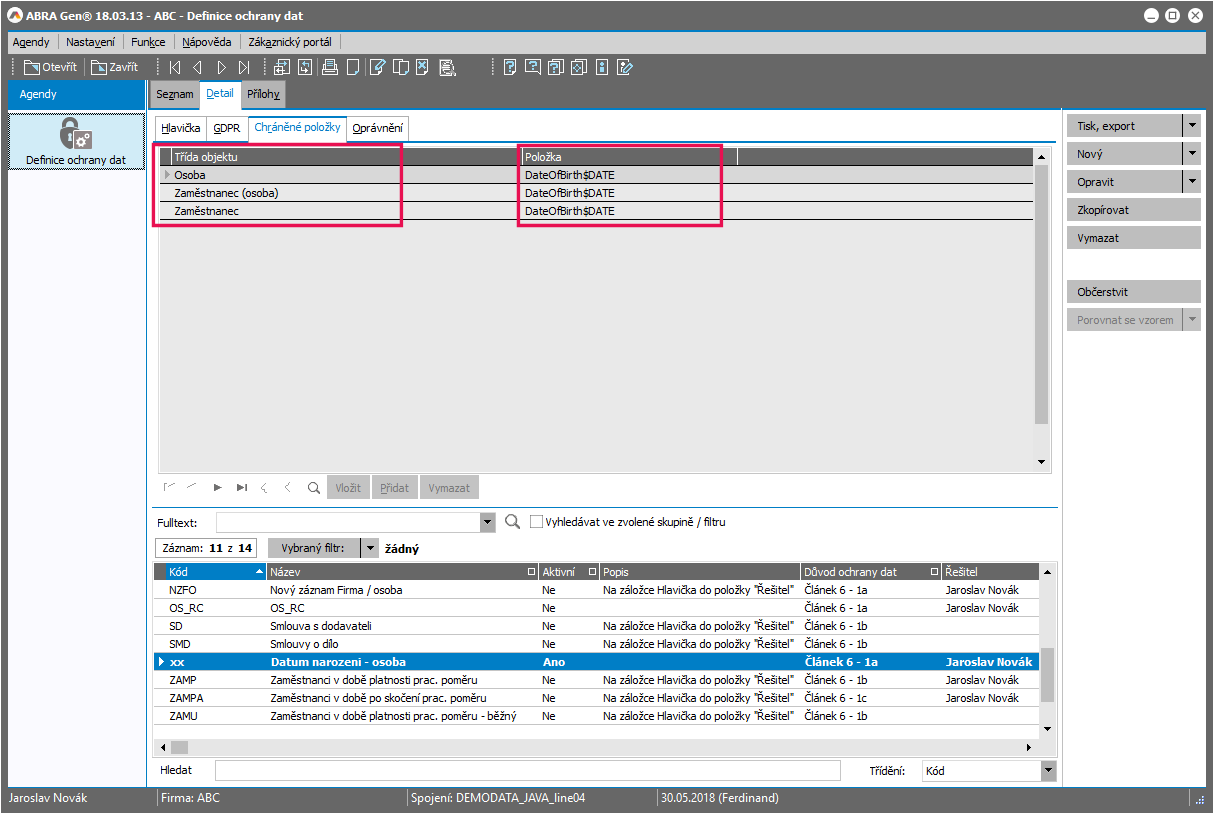 Které položky daných objektů konkrétně budete chránit, není věcí ABRA Gen a není to nijak napevno dáno výrobcem (ani by to nebylo možné, jelikož co je a není osobní údaj, závisí na konkrétní situaci), ale závisí to čistě na vás a na tom, jaké si vytvoříte Definice ochrany dat, viz dále.