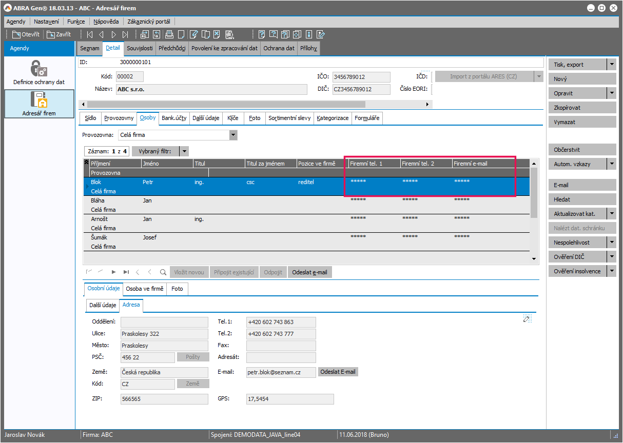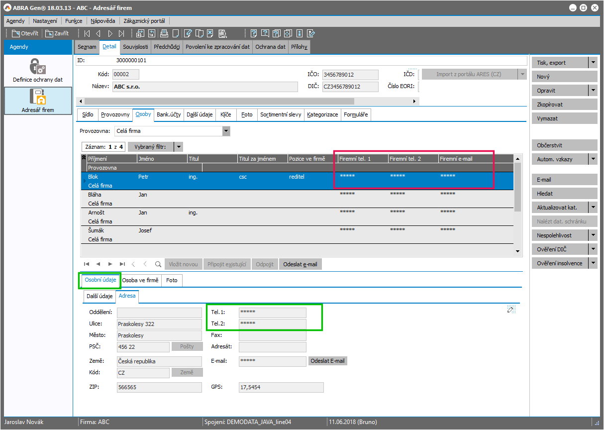 Nechť chceme chránit všechny telefony a e-maily osob připojených k firmě a zobrazovaných u dané firmy. V Adresáři firem na subzáložce sooby se jednak v seznamu připojených zobrazují "firemní údaje" (viz firemní telefon, firemní e-mail) a jednak se ke každé osobě ve spodní části záložky zobrazují osobní údaje dané osoby.