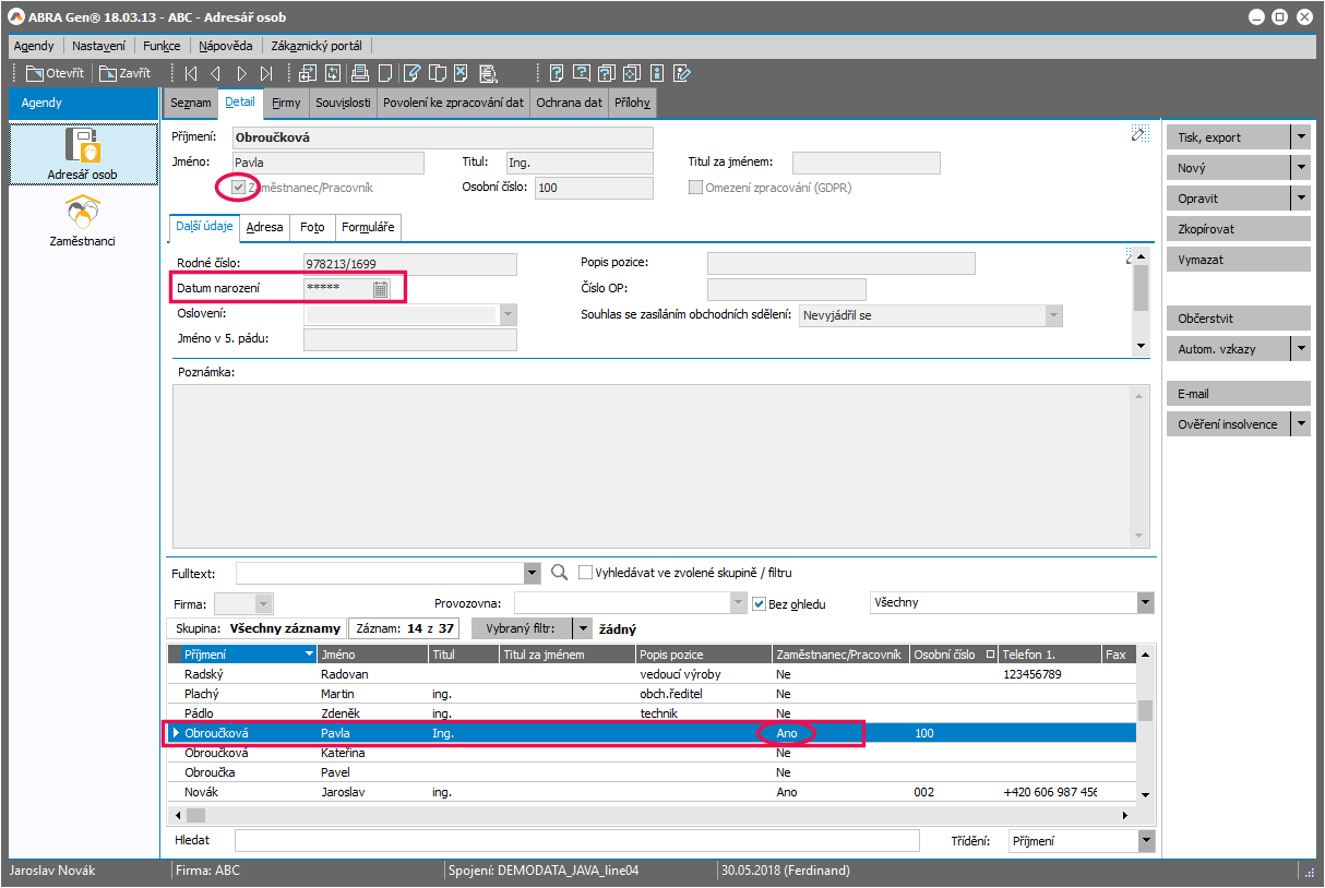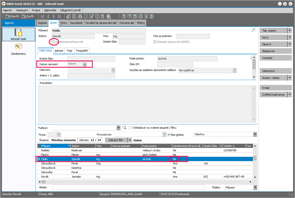 - Osoba - (třída BO Person ) - pro ochranu osob "nezaměstnanců" (bez zatrženého Zaměstnanec/pracovník) a jejich údajů zobrazovaných v Adresáři osob, a samozřejmě i kdekoliv jinde, kam se údaje z adresáře osob propisují