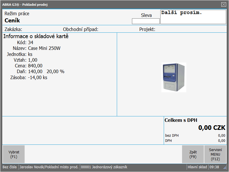 Vybere zobrazenou sklad. kartu a přepne zpět do režimu Prodej, přičemž dané zboží prodá, tj. objeví se na účtence. |