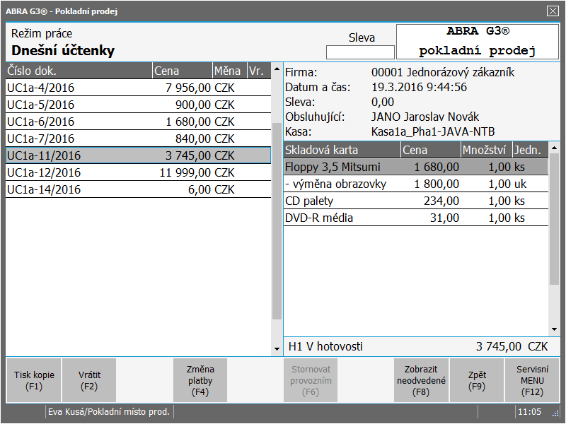 V tomto režimu je v levé části obrazovky zobrazen seznam dnes uzavřených účtenek (tj. zaplacených) a to těch, které byly zaplaceny na aktuální kase (viz též příslušnost účtenek k maloobchodní kase), bez ohledu na to, jestli patří do stejných tržeb, jako má přihlášený Obsluhující. Medzi nimi je možné prechádzať šípkami hore/dole alebo vybrať myšou. V pravej časti okna pokladne sú uvedené položky, ktoré sú namarkované na aktuálnej účtenke v zozname vľavo. Ďalej sú tu o nej uvedené základné údaje, napr. údaj o dátume a čase, kedy bola táto účtenka naposledy "navštívená", kedy sa na nej uskutočnila posledná zmena, celková poskytnutá zľava atď.