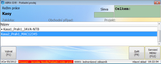 V tomto režime je zobrazený zoznam všetkých pokladní nadefinovaných v Nastavení pokladní a patriacich do rovnakej prevádzky, ako pokladňa aktuálnej účtenky, ku ktorej bol tento režim vyvolaný. Medzi nimi je možné prechádzať šípkami hore/dole alebo vybrať myšou. Aktuálna pokladňa, z ktorej je aktuálna účtenka, ku ktorej bol tento režim vyvolaný, je odlíšená bodkou.