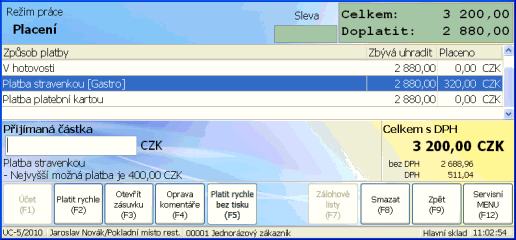 Sú zoradené v poradí, v ktorom sú uvedené v subzáložke Platby danej prevádzky. Pre každý uvedený spôsob platby je uvedené, koľko už bolo zaplatené a koľko ešte zostáva celkovo uhradiť. Typ platby je v tomto prípade možné meniť rýchlo myšou či klávesovými šípkami (aktuálne zvolený spôsob platby je ten, na ktorom stojí kurzor) alebo príkazom Zmena typu platby. Předvolený způsob platby po vyvolání režimu Placení je první v pořadí.