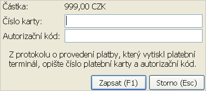Dokončenie autorizácie platieb terminálom v prípade výpadku - Pri platbách terminálom môže dôjsť k situácii, že nebola dokončená autorizácia platby (napr. z dôvodu neočakávaného výpadku PC, na ktorom beží pokladňa, v okamihu, keď prebieha platenie terminálom). V takom prípade pri novom prihlásení k danej účtenke (ktorá zostala otvorená), systém túto skutočnosť nahlási a ponúkne možnosť autorizáciu dokončiť. Môžete potom ručne zadať, či terminál platbu akceptoval alebo nie. Ak nie, platba sa stornuje, ako keby terminál transakciu pri bežnej prevádzke zamietol. Pokud ano, zobrazí se dialog na doplnění informací o dané platbě, které systém ABRA Gen z důvodu přerušení spojení již nemohl získat přímo od terminálu, tj. číslo karty a autorizační kód. Pozor, číslo platobnej karty je potrebné zadávať bez medzier! Po potvrdení sa dané informácie zapíšu na účtenku, ako keby ich vrátil samotný terminál, pokiaľ by k prerušeniu nedošlo. Následne môžete pokračovať v práci.