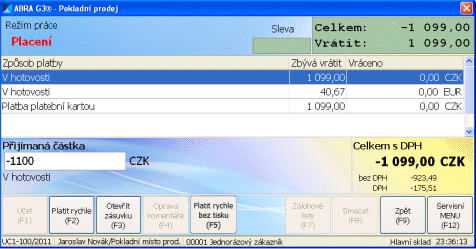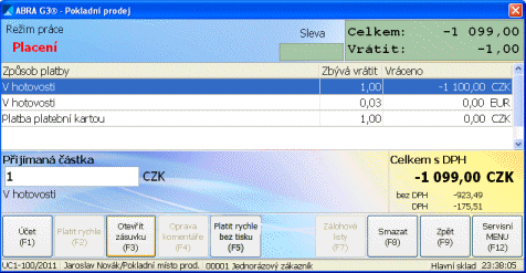 Vrátili sme klientovi 110EUR a klient nám teraz má vrátiť späť 0,1EUR. Tj. do vstupní řádky nyní zadáme +1. V lokalizaci pro SR není k dispozici funkce Platit rychle bez tisku (F5), jelikož zákon vyžaduje tisk pokaždé. |