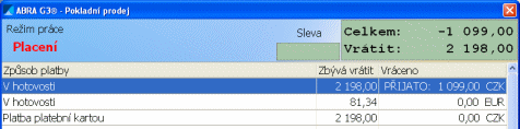 Režim Platenie na maloobchodnej pokladni resp. maloobchodnej dotykovej pokladni slúži na príjem peňazí alebo na zadanie spôsobu, akým je doklad z pokladničného predaja uhradený. O režimu Placení na kase informuje jméno režimu v levém horním rohu a nápis "Přijímaná částka" příp. "Číslo dokladu" při placení zálohou nad vstupní řádkou. Placení dokladu se provádí obdobně jako prodej prostřednictvím vstupní řádky "Smart line" a ovládacími tlačítky resp. odpovídajícími řídícími klávesami, ale pochopitelně jinými příkazy.