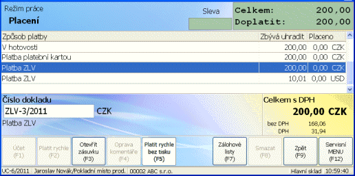 | Příklad vzhledu v režimu Placení s výběrem z povolených kombinací způsobů úhrady a měn. V lokalizaci pro SR není k dispozici funkce Platit rychle bez tisku (F5), jelikož zákon vyžaduje tisk pokaždé. |
