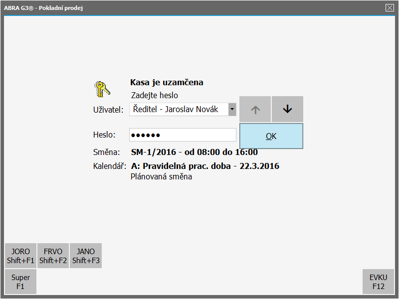 V rámci dialógu prihlásenia k predaju je potrebné zadať obsluhujúceho, ktorý má s pokladňou pracovať. Je možno jméno uživatele napsat do vstupní řádky nebo je vybrat pomocí tlačítek se šipkami. Do druhé vstupní řádky zadejte heslo přihlašovaného uživatele. Tým sa spustí dialóg predaja.