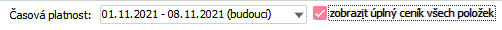 Zobrazit úplný ceník všech položek - Pomocí tohoto zatržítka lze zvolit, jaké položky se mají zobrazovat v subzáložce Seznam položek s ohledem na zobrazovanou platnost ceníku zvolenou v předchozí položce Platnost k datu.
