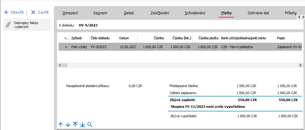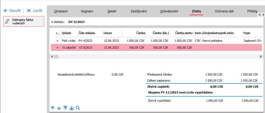 Na řádek se zápočtem DV ("závazek") se také uloží odkaz na započítávanou FV. Ten se použije při zaúčtování. Objasníme na príkladoch: Mějme FV na 1550,- bez platby. Dobropisováno 1000,-. K úhradě na FV tedy zbývá 550,-, Celá skupina FV-DV je nevyrovnaná, na FV zbývá uhradit 550,-. Dobropis se tváří jako neuhrazený ve výši svého předpisu, tj. 1000,-. Pokud se vystaví VZ, vygeneruje se na 1000. Dobropis se poté bude tvářit jako plně uhrazený, za skupinu je třeba vypořádat 550,-: Mějme FV na 1550,- bez platby. Dobropisováno 1550,-. K úhradě na FV tedy zbývá 0,-, Nechť je DV poté zaplacen částečně pokladnou ve výši 1000,-. Celá skupina FV-DV je tedy znovu nevyrovnaná ve výši 1000,-. Dobropis se tváří jako neuhrazený ve výši svého předpisu mínus platby, tj. 550,-. Pokud se vystaví VZ, vygeneruje se na 550, tedy započte se zbylá nezaplacená částka z DV (více nelze započítat).Dobropis se poté bude tvářit jako plně uhrazený, za skupinu je třeba vypořádat oněch zbytečně zaplacených 1000,-: |