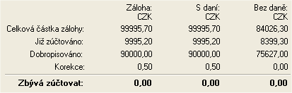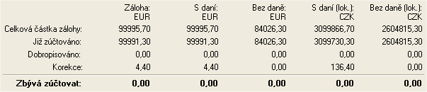 | Už zúčtované | Suma celkových súm z dosiaľ vykonaných zúčtovaní daného zálohového listu do faktúr, tzn. ide vlastne o sumy s daňou. Ide o presnú sumu, bez zahrnutia korekcií. |