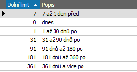 Výber limitov z číselníka Hraníc pre štruktúru pohľadávok a záväzkov, podľa ktorých budú vytvorené časové intervaly na vyhodnotenie štruktúry pohľadávok. Ak je položka nezačiarknutá, potom budú použité všetky nadefinované limity. Objasníme na príklade.
