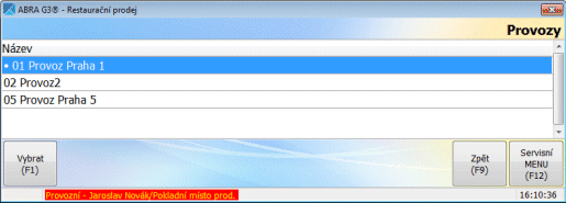 V tomto režime je zobrazený zoznam všetkých prevádzok. Medzi nimi je možné prechádzať šípkami hore/dole alebo vybrať myšou. Aktuálna prevádzka, z ktorej je aktuálna účtenka, ku ktorej bol tento režim vyvolaný, je odlíšená bodkou.