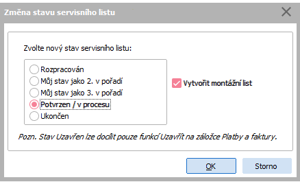 Príklad dialógu na zmenu stavu SL. Stavy "Môj stav ..." uvedené v obrázku demonštrujú prípad, keď si používateľ zaviedol svoje vlastné stavy v danom poradí. V rámci voľby nejakého stavu, ktorý je zatiaľ "bez príznaku", sa môže na začiarknutie priamo ponúknuť voľba Vytvoriť montážny list. Voľba sa ponúka v prípadoch, keď sa predpokladá, že používateľ by mohol chcieť v rámci prepnutia stavu rovno vytvárať ML. Tzn. vtedy, ak aktuálny stav SL nie je stav s príznakom ukončený, uzavretý ani fakturovaný. Ak je voľba začiarknutá, vyvolá Sprievodcu tvorbou montážneho listu. Ide o jednu z možností vystavenia nového ML. |