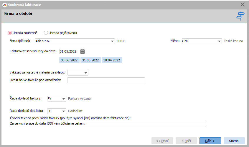 V tomto kroku jsou z vybraných SL, nad nimiž byla funkce vyvolána, zobrazeny ty, jež lze aktuálně fakturovat (tj. jsou uzavřeny a v položce Firma plátce mají zadánu stejnou firmu, jako byla zadána v 1. kroku průvodce).