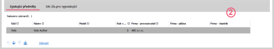 Zobrazuje vyhľadané záznamy servisovaných predmetov, ktoré vyhovujú podmienkam zadaným vyššie v Paneli vyhľadávacích údajov, kde je popísaný aj spôsob a výsledok hľadania. Význam jednotlivých tu zobrazených položiek vyplýva z ich názvu alebo z ich popisu v záložkách Zoznam resp. Detail agendy servisovaných predmetov.