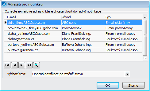 Tu hľadá v údajoch sídla firmy, prevádzkarne zadanej v údajoch servisovaného predmetu a ďalej v služobných údajoch i privátnych údajoch všetkých osôb pripojených k tejto firme (teda tu bez ohľadu na to, či daná osoba je či nie je zadaná v hlavičke servisovaného predmetu). Vybrané označené e-mailové adresy následne pridá do zoznamu Adresátov notifikácie, pričom do položky Text e-mailu im predvyplní šablónu vybranú v spodnej časti dialógového okna v položke Východiskový text z číselníka Texty notifikácie stavov.