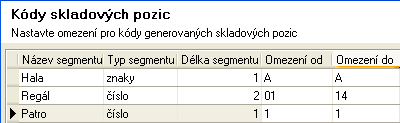 Príklad zadaného obmedzenia pre segmenty kódov pozícií, ktoré sa majú vygenerovať v tomto kole generovania (pre prvé poschodia 14-tich regálov v hale A)