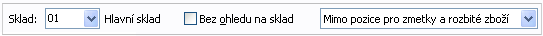 V zobrazenom zozname skladových pozícií je možné zobrazovať len pozície prislúchajúce konkrétnemu skladu. Na to slúži prvá časť obmedzovacieho panela (lišty). Buď začiarknete predvoľbu Bez ohľadu na sklad anebo zadáte hodnotu do číselníkovej položky Sklad - potom uvidíte pozície len na tomto Sklade. Ponúkajú sa len sklady, ktoré sú polohované.