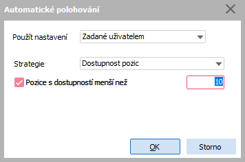 V položce Použít nastavení můžete zvolit, zda použít nastavení skladové (v tom případě se předvyplní strategie dle nastavení Strategie pro naskladnění / vyskladnění ze záložky Detail Agendy Sklady a nemusíte se výběrem strategie zabývat) nebo uživatelské (v tom případě si strategii pro dané automatické napolohování uživatel vybere sám). Zvolená stratégia sa pamätá na používateľa a pri ďalšom otvorení dialógu sa prednastaví.