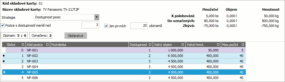 - V pozici musí být dost místa, aby se tam zboží vešlo a pozice musí mít dostatečnou nosnost (volná kapacita pozice je dána v jejích položkách Volný objem a Volná hmotnost), tj: