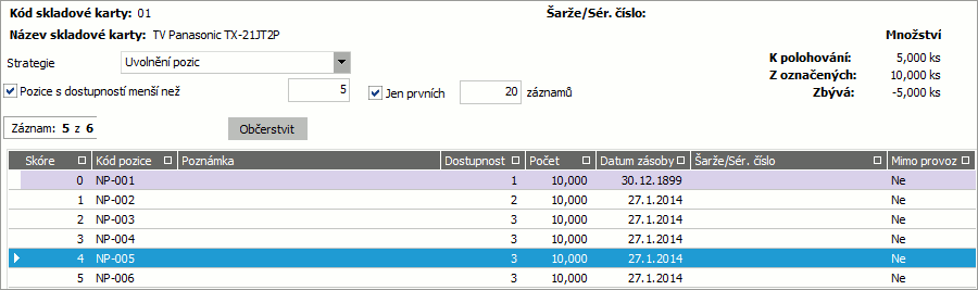| Len prvých x záznamov | Možnosť obmedziť počet zobrazených záznamov (využijete v rozsiahlych skladoch s veľkým množstvom pozícií). |