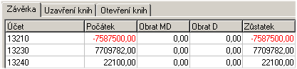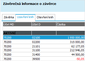 - Uzavretie kníh - vykonané uzavretie účtovných kníh. Ako bolo povedané vyššie, ide iba o tlače závierkových pohybov, v skutočnosti sa žiadne také pohyby v účtovnom denníku neobjavia. Takže ide o fiktívne zaúčtovanie vypočítaných zostatkov aktívnych a pasívnych účtov oproti Konečnému účtu rozvahovému zadanému v predošlom kroku závierky a výnosových a nákladových účtov oproti zadanému Účtu ziskov a strát. V položce Částka jsou uvedeny vypočtené zůstatky jednotlivých účtů, jsou-li záporné, jsou zvýrazněny opět barevně, viz popis předchozí záložky.