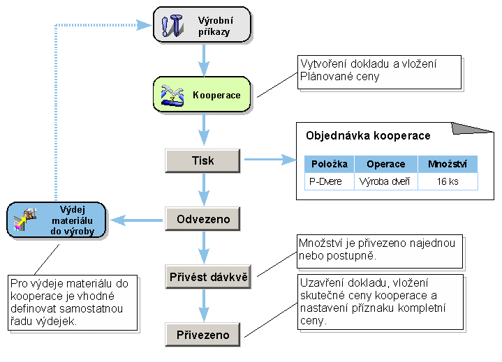 Agenda Kooperácie slúži na evidenciu vyrábaných položiek a ich operácií a sériových čísel odoslaných do kooperácie.