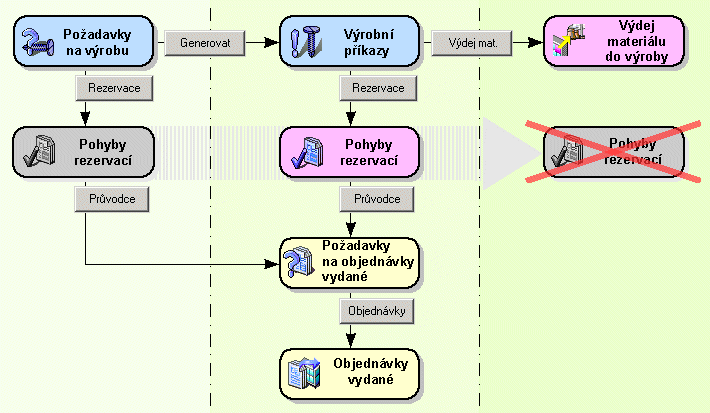 Rezervace vytvořené u Požadavku na výrobu se při vytvoření Výrobního příkazu přenesou k tomuto příkazu. Pri zmazaní výrobného príkazu sa zmažú aj jemu prislúchajúce rezervácie, vrátane tých, ktoré pôvodne boli prenesené z požiadavky. Pri ukončení výrobného príkazu sa zrušia nevyužité rezervácie, viď tiež všeobecné informácie na spustenie a ukončenie výrobného príkazu.