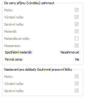 Pevná cena - K vyššie spomínaným položkám je tiež možné pripočítať pevnú cenu. Ale v tomto prípade nebude žiadny doklad túto hodnotu účtovať ako nábeh účtu nedokončenej výroby. Ak si chcete nastaviť túto možnosť, preštudujte si vlastnosti použitia pevnej ceny v ďalšom texte.