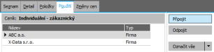 Příklad připojení individuálního ceníku k vybraným firmám. Připojením začne daný ceník pro obě firmy platit současně vedle ceníku, který je aktuálně nastaven jako Hlavní