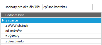 Poté pomocí funkce Nový klíč zadáme opět do položky Hodnoty pro aktuální klíč název našeho druhého klíče Kontakt a obdobně jako pro klíč Obchodní vztah nadefinujeme hodnoty klíče Způsob kontaktu a uložíme: