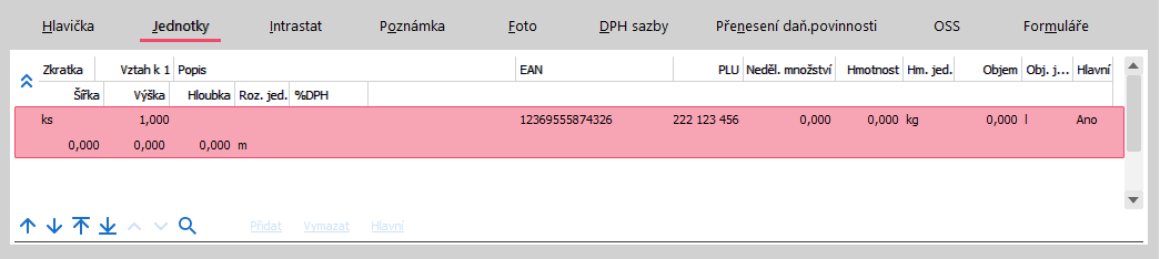 V subzáložce Jednotky zavedeme jednotku kusy se zkratkou ks se vztahem 1 (bude předvyplněna). U jednotky ks by mělo být uvedeno, že je hlavní, pokud není, nastavte ji jako hlavní funkčním tlačítkem v navigátoru pod seznamem jednotek.