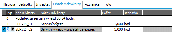 Zadáme makrokartu na Servisní výjezd-expres celkem. Třída karty=Makrokarta, jednotka hod. V subzáložce Obsah makrokarty zadáme její obsah. Můžeme zadávat až 4 typy řádků (text, text s částkou, text s částkou a počtem a skladový řádek s položkou ze skladu). V položce Typ vybereme např. typ 0 - textový řádek a do textu zadáme: "Poplatek za servisní výjezd do 24 hodin:". Na dalších řádcích v obsahu makrokarty zadáme typ 3 - skladový řádek a vybereme ze sklad. karet karty Servisní výjezd- základní sazba a Servisní výjezd- expresní příplatek a v počtu 1hod. je zadáme do makrokarty. Tím je obsah makrokarty stanoven.
