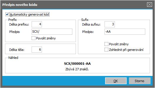 více vpravo od položky Struktura šarže/s.čísla se objeví okno, v němž zatrhneme Automaticky generovat kód, kód zadáme např. ve tvaru: prefix 4 znaky SCX/, délka těla 6 znaků, sufix 3 znaky -AA.