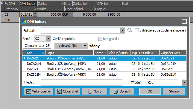 V Obsahu zadáme sazbu DPH a DPH index výběrem z vyvolaného číselníku: