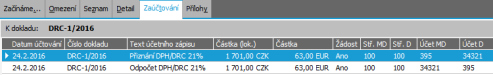 Prohlédněte si záložku Zaúčtování dokladu DRC, kde je vidět, jak se doklad DRC promítl do účetnictví. Pokud jste použili pro DRC Základní předkontaci defaultně dodávanou, pak by záložka Zaúčtování daného DRC měla vypadat zhruba následovně:
