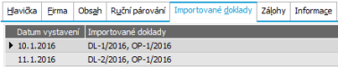 2. Prohlédněte si importované doklady do vystavené faktury FV-1/2016. Viz záložka Detail→subzáložka Importované doklady. Pokud jste postupovali dle příručky, měl by jejich seznam vypadat následovně: