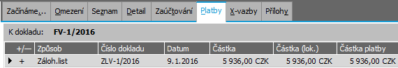 3. Prohlédněte si záložku Platby vystavené faktury FV-1/2016. Pokud jste postupovali dle příručky, měl by seznam dosud provedených plateb obsahovat zatím pouze zálohový list zúčtovaný do faktury: