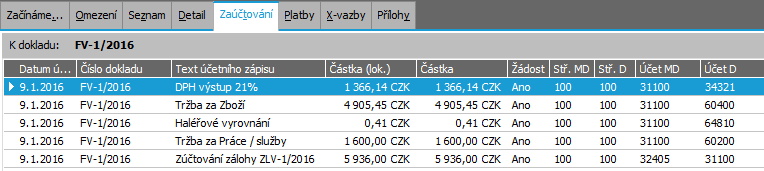 Řádky faktury se předkontovaly dle základní definice předkontace pro Faktury vydané, přičemž řádky faktury se sloučily podle shodných účetních údajů na zaúčtování základu (zvlášť pro typy příjmů zboží a služby), DPH v obou sazbách a příp. i zaokrouhlení. Součástí zaúčtování faktury je i zaúčtování provedeného zúčtovaní zálohového listu ZLV-1/2016 do dané faktury pod číslem faktury, jelikož o předpisech záloh se neúčtuje, ale účtuje se až o zúčtování zálohy spolu s dokladem, do něhož bylo zúčtováno. Řada dokladů FV má nastaveno účtovat do žádostí, tudíž se jedná zatím o žádosti.